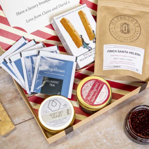 Beautifully wrapped in traditional parcel paper, with twine and ink stamps, this special little hamper makes the perfect surprise delivery, containing everything to treat your friends and family to a truly luxury breakfast surprise.
